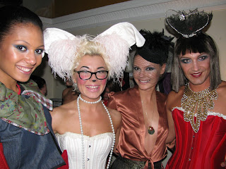 Last night's fashion show art music menage a trois was a spectacular event and I was so pleased that Godiva had been one of the 6 high quality, individual independent stores asked to be involved. For the first time in a long time I was backstage dressing my assigned model Diana Strausa from Colours Model Management Glasgow. She was perfect for the collection that we showcased and a real pleasure to work with. Backstage always has such high energy, there was a lot of laughter, wine and it was a good chance to chat to the models and to the other designers. Stylist Ian Tod was not there to style this time but to dress in drag for a show finale! The lovely ever-so-cute Asta was backstage to, dressed as Alice in Wonderland's white rabbit. I forgot how quickly you have to move, change, deal with disasters. We only had one hitch throughout the changes where we could not place one of the feather vintage hats on Diana in time before she ran off to go out. I chased her down the corridor and nearly end up on the runway myself with hat and hairpins in hand with a slight flustered rouge glow. I would like to thank Nikki Kent who came along to assist me backstage. It was her first backstage experience and hopefully not her last.